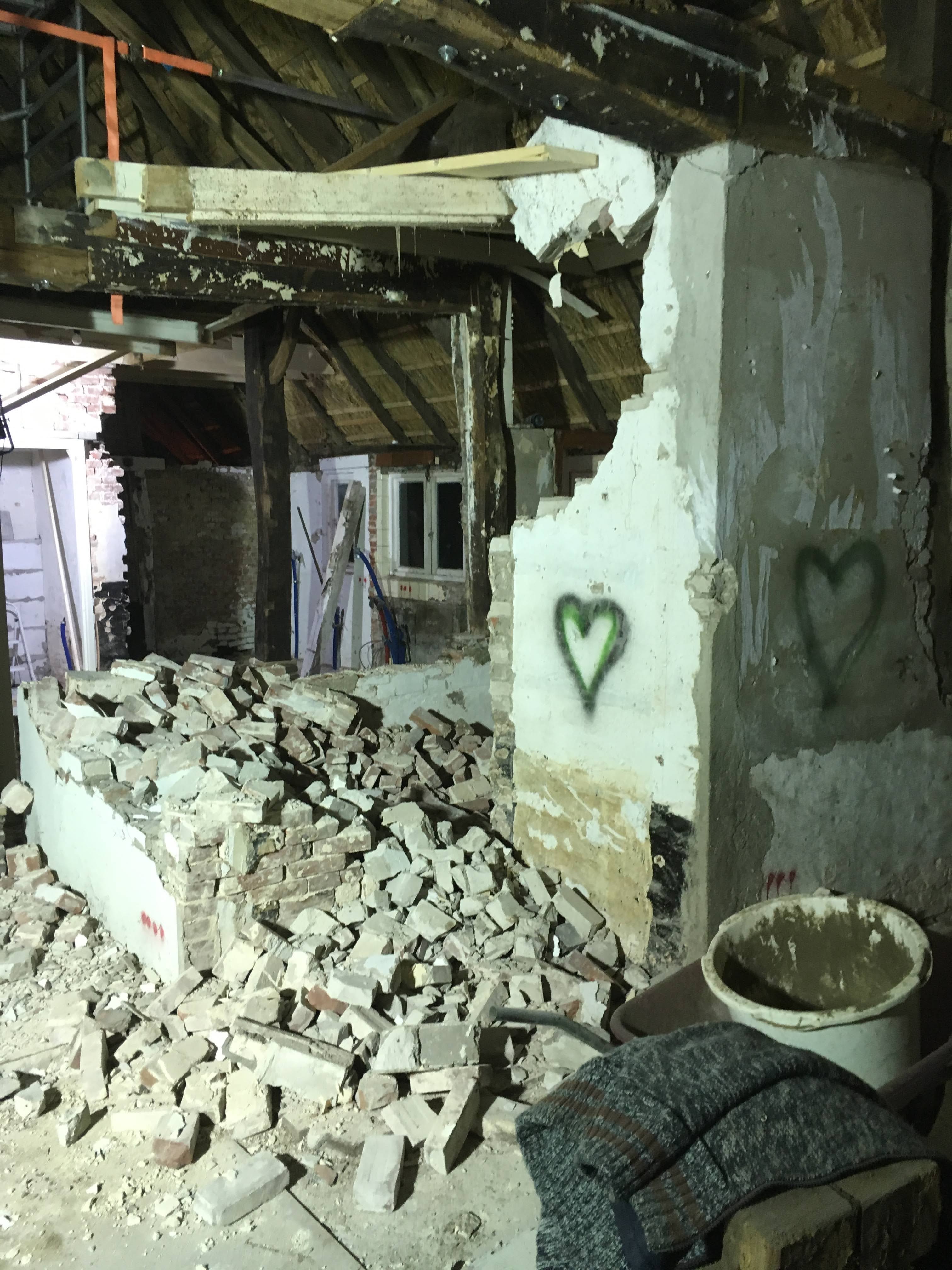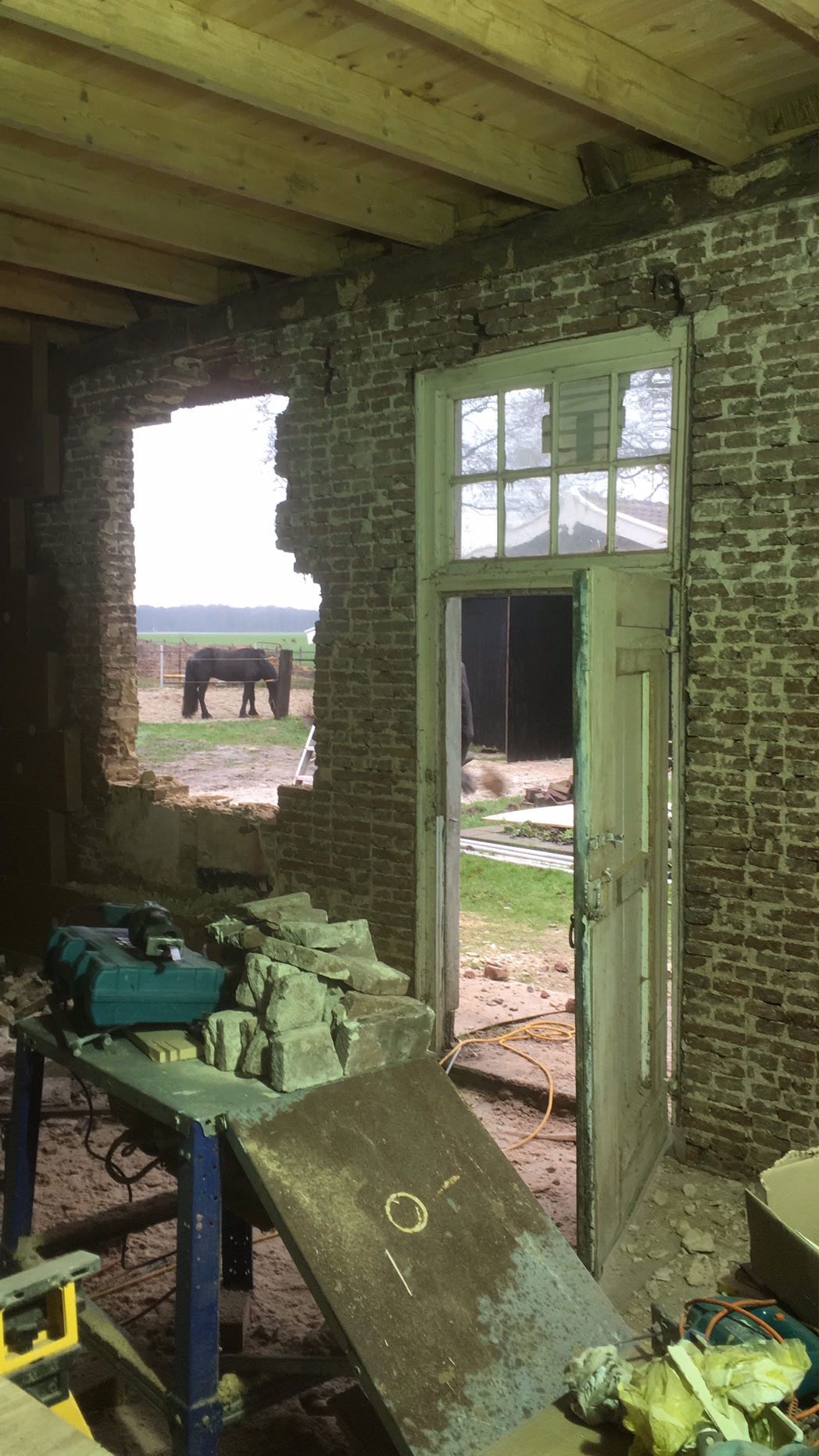 Het overzicht houden was moeilijk. Marjan: ‘Toen bleek dat er asbest aanwezig was. De daken van de schuren en de vensterbankjes in het huis. Dat kostte bij elkaar zo’n 10.000 euro. En de verzekeraar wilde ons pand om die reden ook niet verzekeren. Dat we nog steeds de financiering niet rond had, hielp daar ook niet bij. Dat is ons pas in 2021 gelukt.’ Andy: ‘We hebben een tijdje op allerlei plekken gewoond, in totaal verhuisden we zes keer. In de winter van 2019 was het huis enigszins ingericht en zijn we er gaan wonen. Het was niet comfortabel, maar we leerden het huis zo wel goed kennen. Overal was vocht en schimmel. We kwamen er achter dat het vocht in de muren geen optrekkend vocht was, maar condensvorming. Hierdoor was ook veel schimmel ontstaan.’