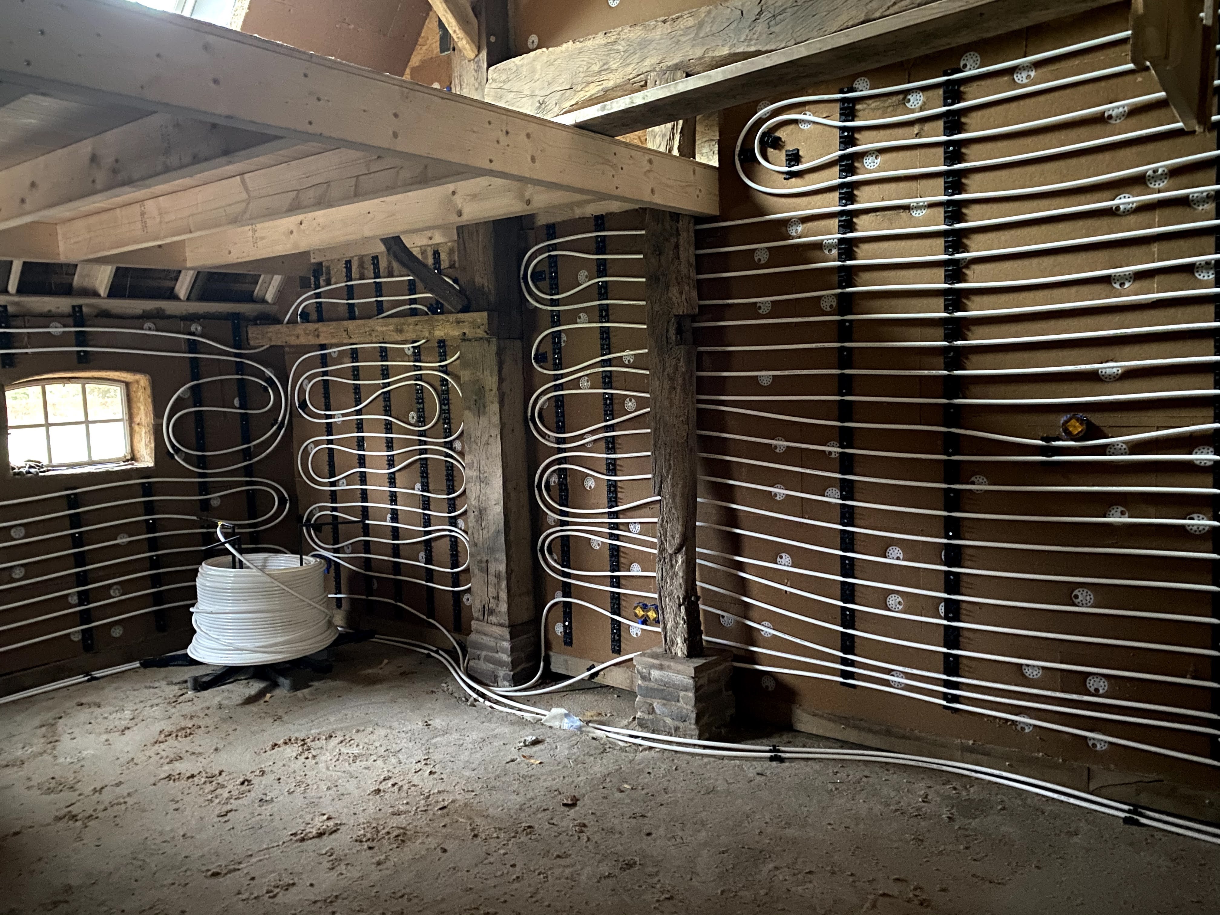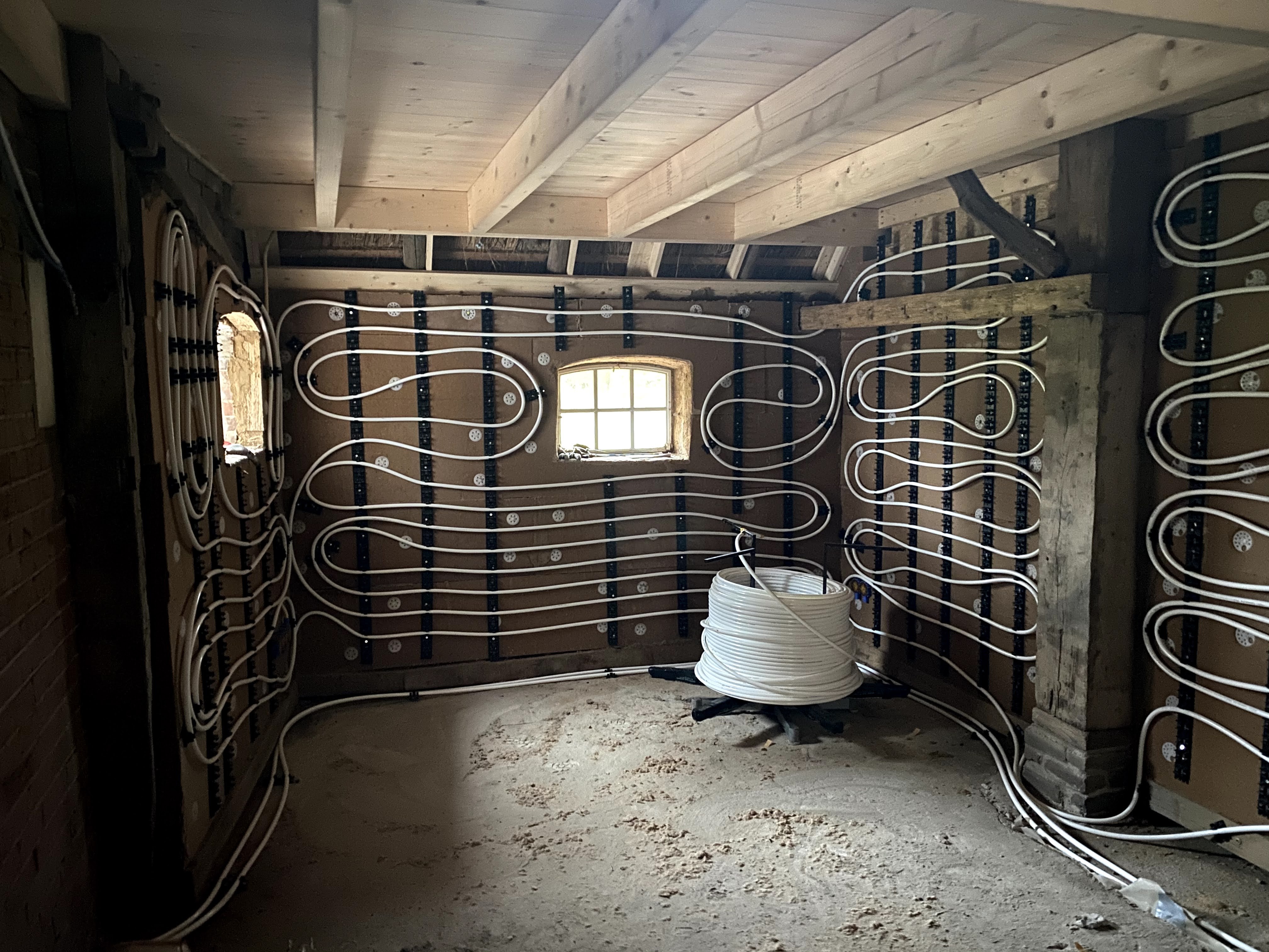 Het verduurzamen en dan met name de isolatie, was een traject op zich. Andy vertelt: ‘Een bouwtekenaar had een plan gemaakt, maar die tekenaar kwam niet uit de restauratiewereld. Er was gedacht aan beluchting, ontluchting, voorzetwandjes en isolatie met folie en glaswol. Maar wij vonden: dat hoort niet bij een monument. Toen zijn we aan het denken gekomen: hoe deden mensen het vroeger dan?’ Marjan: ‘We deden inspiratie op bij het Polderhuis in Amsterdam. Dat huis is verduurzaamd zonder het monument aan te tasten. Daar hadden ze vloerverwarming en muurverwarming in lemen wanden. Dat is damp open en dat vonden we belangrijk, gezien het condensprobleem.’ Andy vult aan: ‘Ook het huis van Bartje in Assen is volgens die methode geïsoleerd en verwarmd, met aandacht voor vochtproblematiek.’
