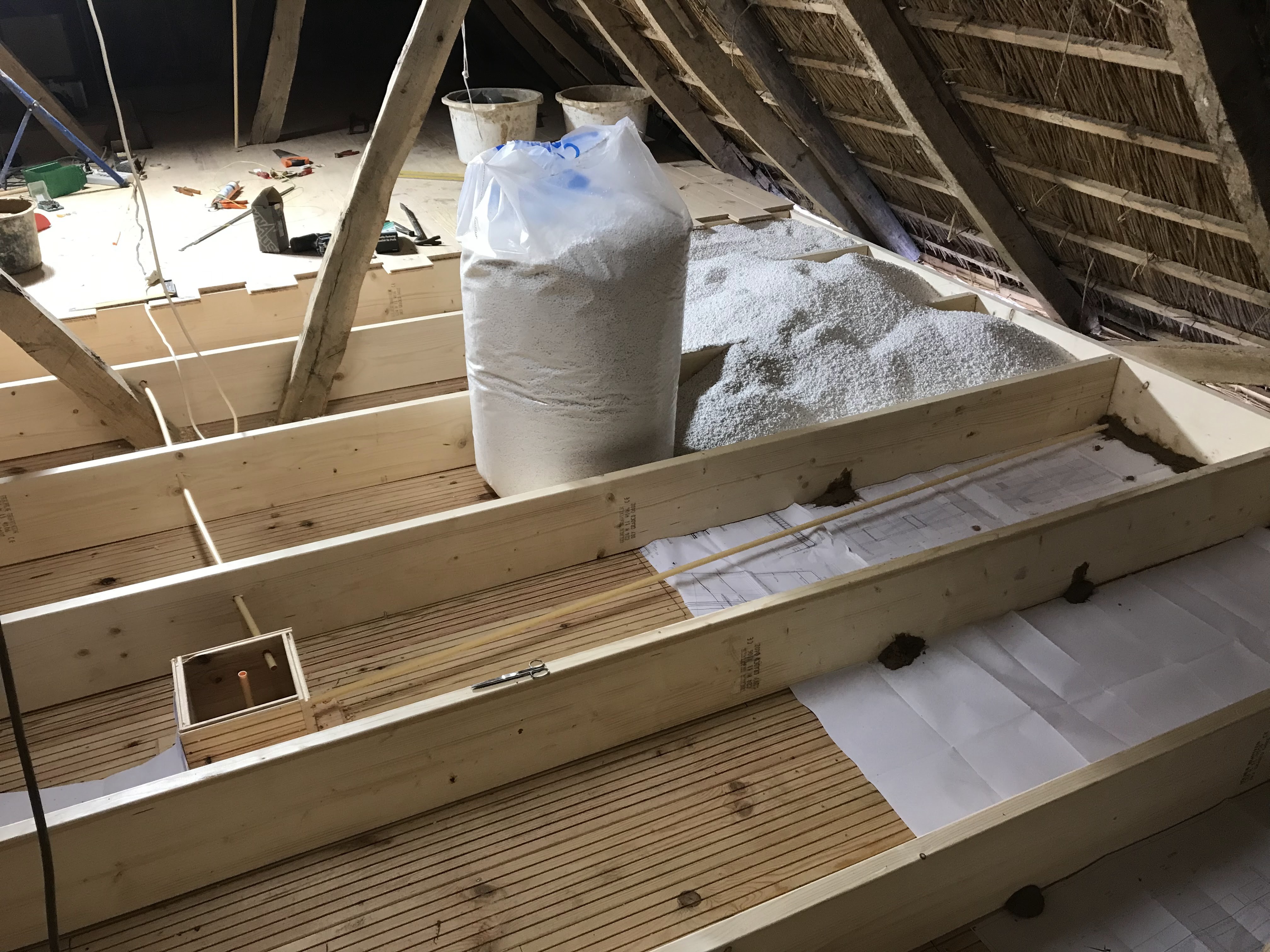 Het plafond is van hout en daar bovenop ligt een 30 centimeter dikke perlit laag. Dat zijn kleine korrels gemaakt van gemalen lava. Marjan: ‘We hebben hier bewust voor gekozen, omdat muizen en ratten hierin niet kunnen nestelen. En het is ook ademend materiaal. We hebben tussen het voorhuis en de deel een wand geplaatst, de spouw daarvan hebben we ook gevuld met perlit. We hebben heel goed gekeken naar hoe vroeger gebouwd werd. In Duitsland zie je bij vakwerkhuizen dat er onder het vakwerk altijd een horizontale houden balk ligt. Die balk houdt het vocht tegen. Een verticale balk trekt het vocht juist omhoog. Dat soort dingen namen wij over.’