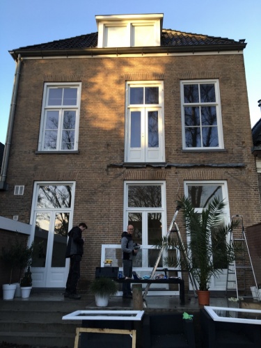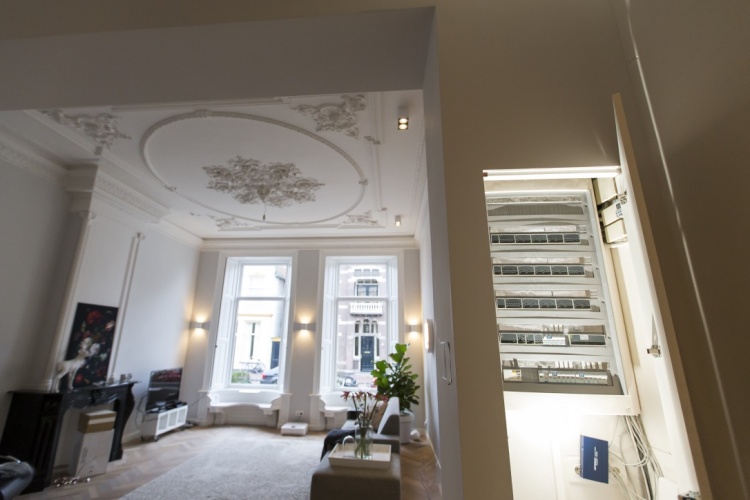 ‘Om het energieverbruik te beperken, hebben we bekeken waar het besparingspotentieel zat. We hebben het huis en het dak zoveel mogelijk van binnenuit geïsoleerd. Daarbij hebben we ook gedacht aan de ventilatie. Daarover heb ik advies gevraagd in mijn netwerk. Het is belangrijk om je voldoende in de bouwfysica te verdiepen. Als je alleen maar isoleert en niet nadenkt over ventileren creëer je elders in je pand problemen. We moesten beneden wel het enkelglas houden, dat is energetisch gezien niet ideaal, maar de luiken compenseren dat enigszins. We hebben ook flink geïnvesteerd in een domotica systeem. Verlichting, beveiliging en verwarming kan ik digitaal aansturen. Nu kunnen we wat dat betreft veertig jaar vooruit.’