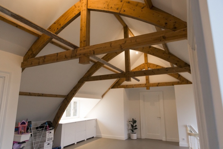 ‘In de jaren vijftig woonde hier een kinderarts met zijn gezin. Ik heb een dochter daarvan over haar jeugd hier laten vertellen. Vier kinderen, een assistente en een dienstmeid moesten allemaal een eigen kamer en daarom waren er op zolder allemaal kamertjes gebouwd. Het was daar enorm hokkerig geworden. Daar zat geen enkele monumentale waarde in, dus we hebben alles weggesloopt. Toen alles kaal was op zolder, kwam een prachtige spantenkap tevoorschijn. Een soort omgekeerd schip. Tussen de spanten hebben we isolatie aangebracht. De zolder is nu een mooie, open ruimte waar de spanten eruit knallen.’