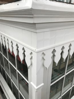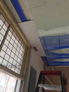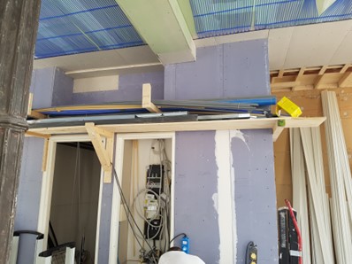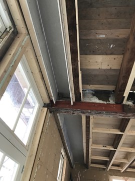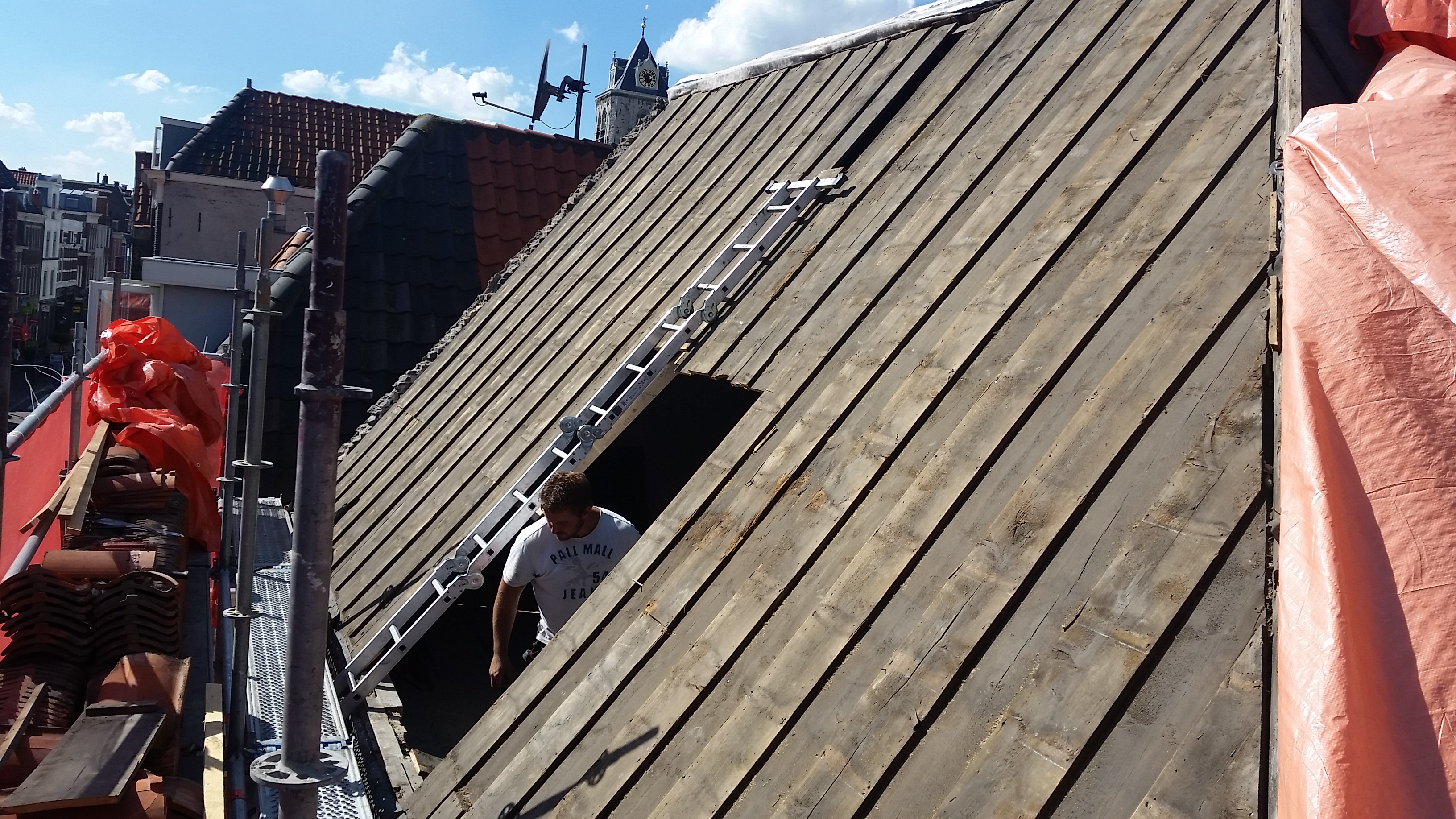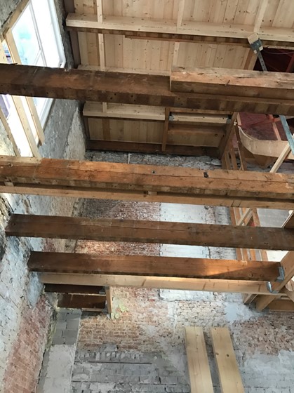 Bij het strippen kwam ook het oorspronkelijke dakbeschot tevoorschijn. ‘Dat wilde ik graag in het zicht houden omdat het van monumentale waarde is. Daarom hebben we het dak aan de buitenzijde geïsoleerd. Daar zijn de vergunningverleners wel verdacht op, want vaak krijgt het gebouw dan een zogenaamd ‘hoedje’. Wij hebben dat weten te ondervangen door voor de isolatie heel dunne folie te gebruiken, Actis trisolaine, met wol dus. Het is flinterdun, maar zeer effectief! Het werd aangebracht op 30 september 2016, een warme dag. De dag daarna voelden we binnen al een enorm verschil. De werklieden konden het niet geloven. De dakisolatie is juist ook in de zomer van belang, want de hele dag staat de zon op het dak te branden. Er is nog 1 stuk muur van ons pand onbehandeld, alleen die muur warmt op.’