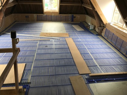 Voor de isolatie gebruikte Jeroen Pavatherm; panelen van samengeperste houtvezels. ‘Pavatherm en het alternatieve product Homatherm zijn hydrofiel. Het neemt water op en het staat het ook weer af. Ik woon in een spons,’ zegt Jeroen lachend. ‘Door met name rondom de koppen van de balken laagtemperatuur verwarming aan te leggen, blijven de koppen droog omdat warmte vocht verdrijft. Dat is normaal een risico. Maar hier dus niet. Het binnenklimaat in het pand is qua vochtpercentage superstabiel.’