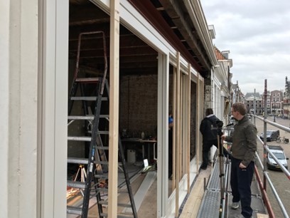 De grote uitdaging bij verduurzaming van monumenten ligt op bouwfysiologisch vlak. ‘Maar ik liet me daardoor niet afschrikken. Overal is een oplossing voor te vinden,’ zegt Jeroen. ‘Bij verduurzamen is de schil kierdicht maken de eerste stap. In mijn pand zit overal hout. Uitgangspunt is dat je niet wilt dat er vocht bij het hout komt. Nu is er binnen natuurlijk altijd vocht: koken, douchen, ademen of met een natte jas binnenkomen, ik noem maar wat. Glas staat qua warmte- en dus vochtgeleiding op de eerste plaats en daarna volgt hout. Het glas hadden we ondervangen, daarover later meer. De belangrijkste stap was dus: zorgen dat het vocht niet bij het hout van de constructie kon komen.’