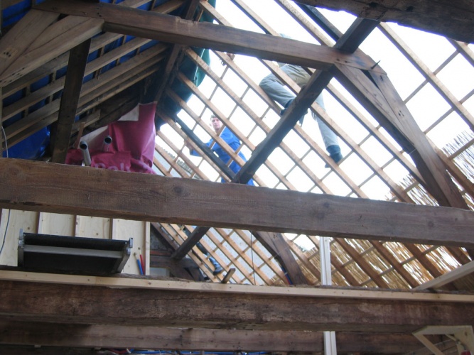 ‘Op het erf stonden twee totaal vervallen schuren. Ze waren niet monumentaal, maar er lagen wel oude pannen op. We hebben deze schuren afgebroken en twee nieuwe schuren opgebouwd, waarbij we oude materialen en technieken, zoals pen-en-gatverbindingen, gebruikten. We waren bang dat de gemeente geen toestemming zou geven voor het opnieuw plaatsen van deze twee schuren. Voor de beslotenheid op ons erf vonden wij ze erg belangrijk, maar er is een regel dat je in het buitengebied niet zomaar allerlei nieuwe gebouwtjes op een erf mag plaatsen. Maar de gemeente was gelukkig erg enthousiast over onze plannen.’