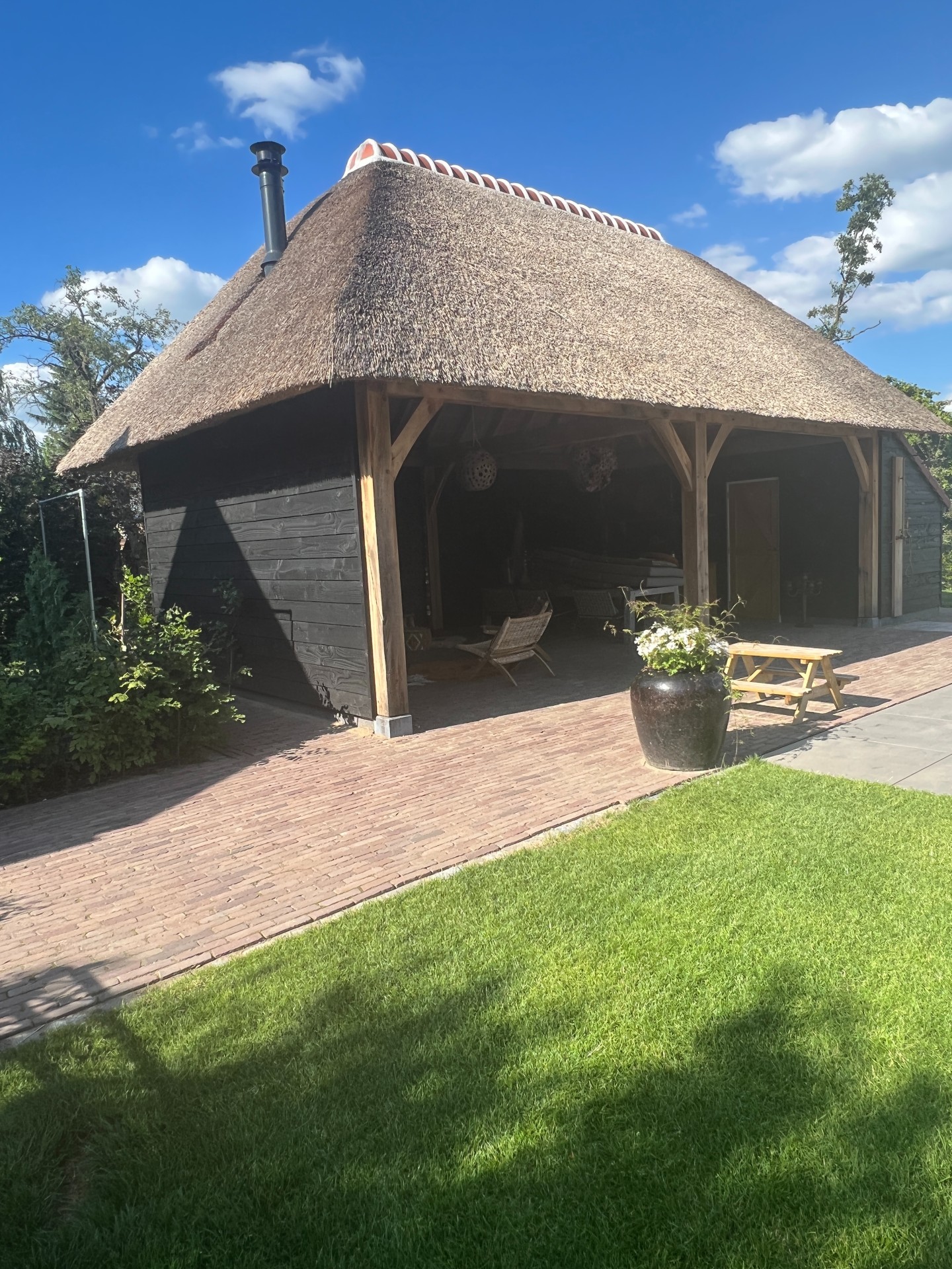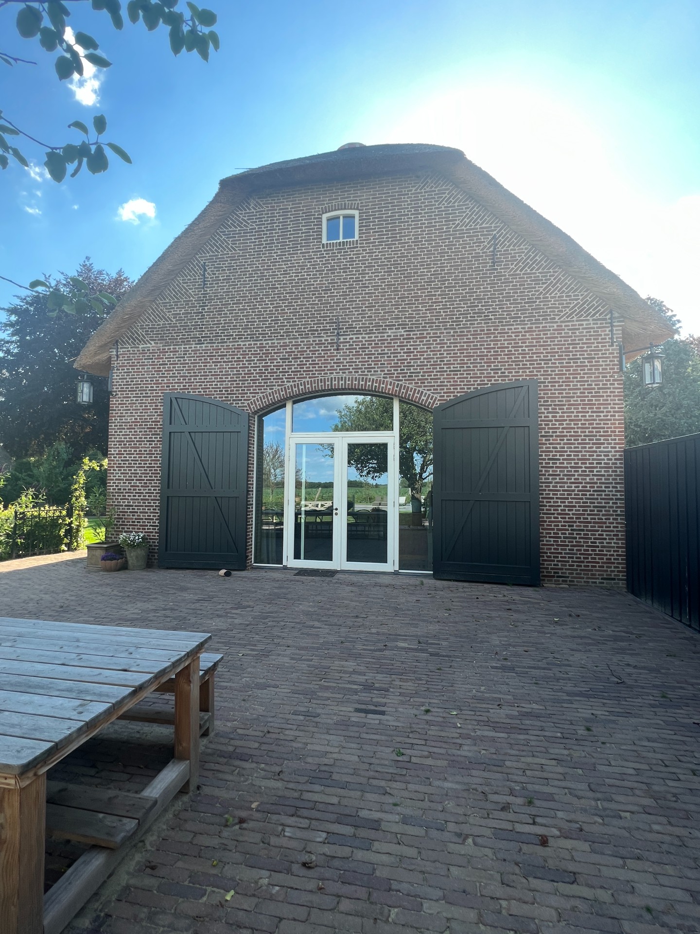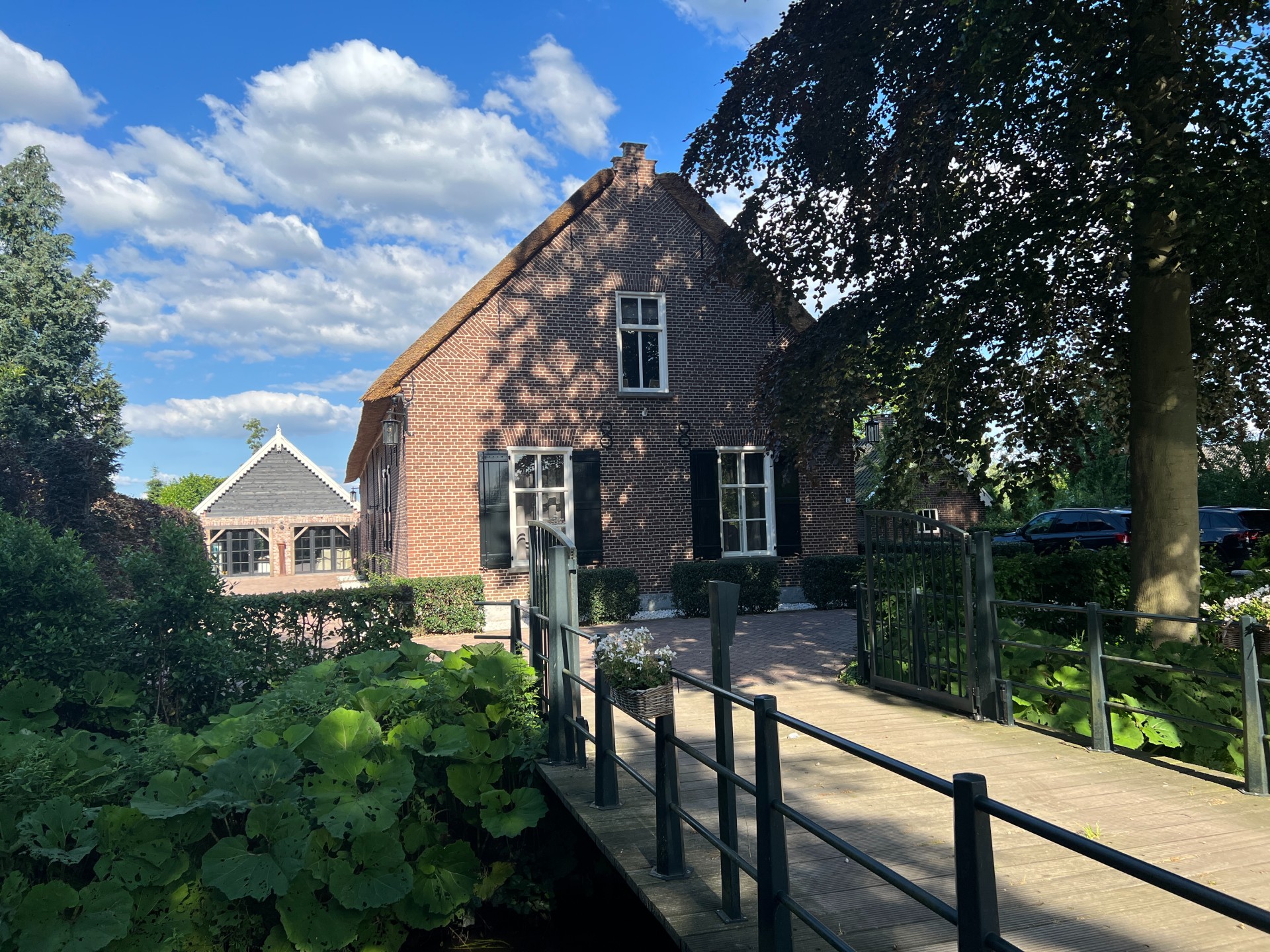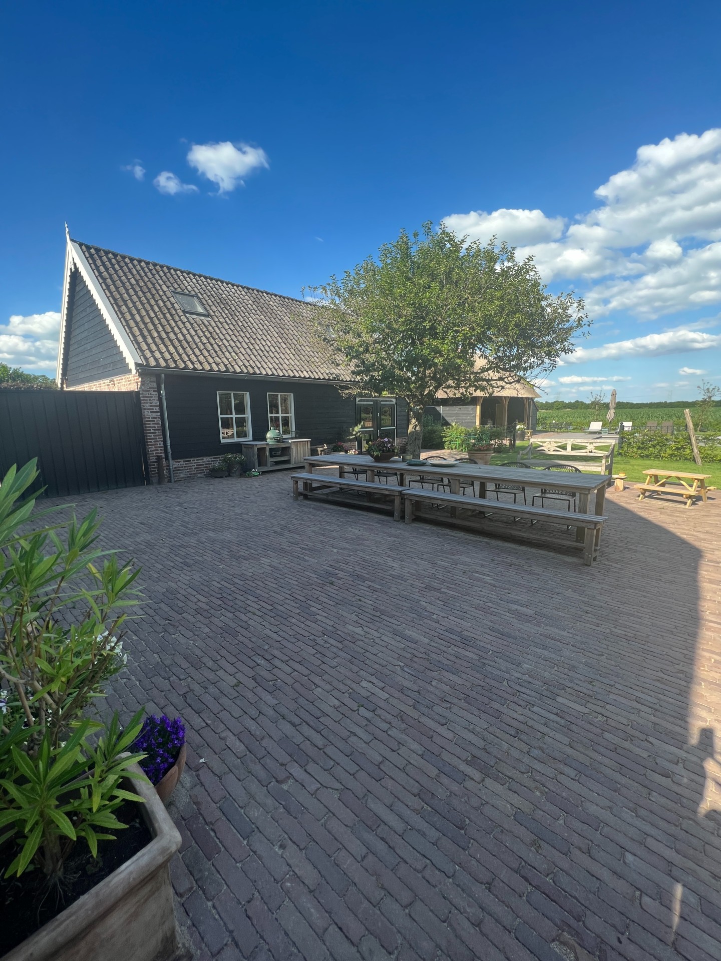 Ook aan de buitenkant zijn Kees en Joyce druk geweest met het terugbrengen van het oorspronkelijke boerenerf. ‘We kochten niet alleen een pand, maar ook 3000 m2 grond. We hebben de betonnen tegels van 30 bij 30 weggehaald en daarvoor in de plaats gebakken klinkers laten leggen. En we hebben net als vroeger weer een boomgaard met peren en appels. De oude walnotenboom staat prachtig in het midden!’ Het beregeningswater voor de tuin wordt uit de Vaart gehaald die voor het huis langs loopt. ‘Bij droogte wordt deze niet gebruikt. Maar hier besparen we in gewone tijden heel wat drinkwater mee.’