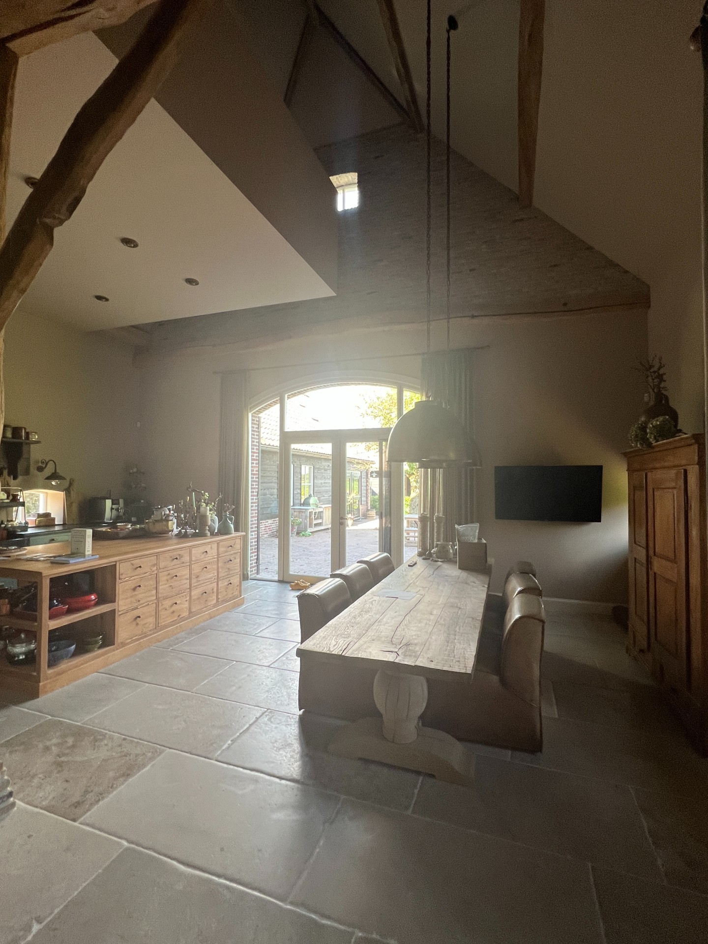 Kees is eigenaar van een bouwkundig advies- en ontwerpbureau. ‘Ik zat dicht bij het vuur en kon in de voorbereiding van al het werk veel zelf doen. Een installateur heb ik de berekeningen van het installatiewerk laten doen. Wij wilden de keuken van het voorhuis ook naar het achterhuis brengen. Daar hebben we een prachtig uitzicht over de landerijen. De achtergevel is er daar helemaal uit geweest en opnieuw opgebouwd. Er zaten wat kleine raampjes en een staldeur. Nu zit er een getoogde pui in van 5 bij 3,5 meter. Daar hebben we openslaande staldeuren bij laten maken. Hier hebben we met de welstandscommissie wel even over gesproken, maar uiteindelijk gingen ze akkoord.’