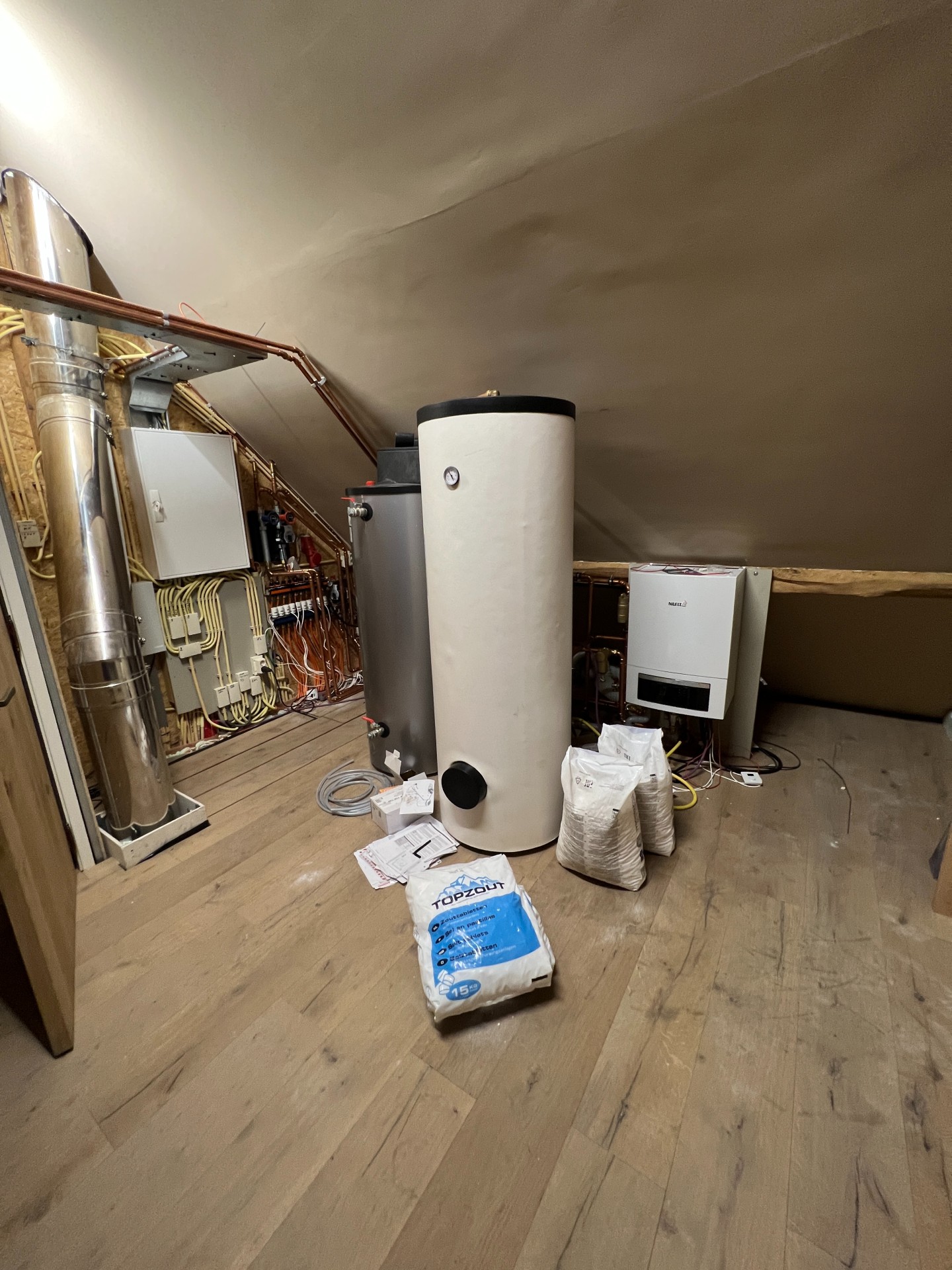 Het pand werd dus gestript, de vloer ging eruit en het dak ging eraf. ‘We hebben op iedere verdieping overal vloerverwarming. We hebben een warmtepomp, die in de zomer ook werkt als koeling. In de zomer gaat er koud water in het systeem. Hoe warm het buiten ook wordt, hierbinnen is het een graad of 22, 23. En we hebben in de winter gemerkt dat het ook dan comfortabel is. Warm tapwater krijgen we via een elektrische boiler.’ De energievoorziening komt dus via een warmtepomp en via zonnepanelen die verderop op het terrein van Kees en Joyce staan. ‘Ze staan tegen een maisveld aan, we hebben aan de voorzijde een lage beukenhaag geplaatst, zo is er vanaf het huis en vanaf de straat niets van te zien.’