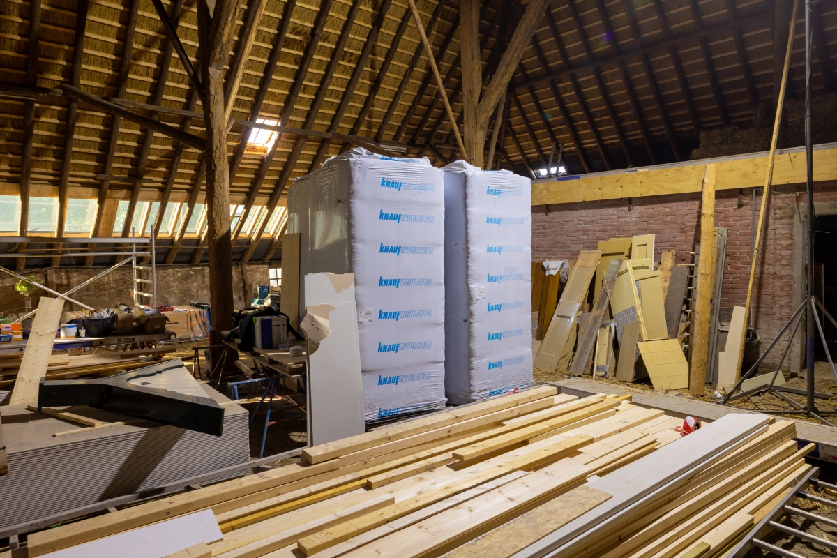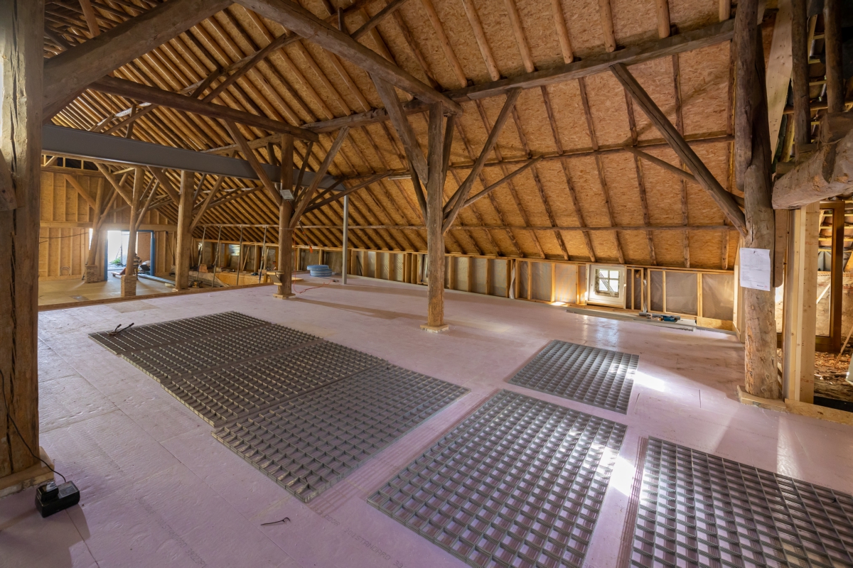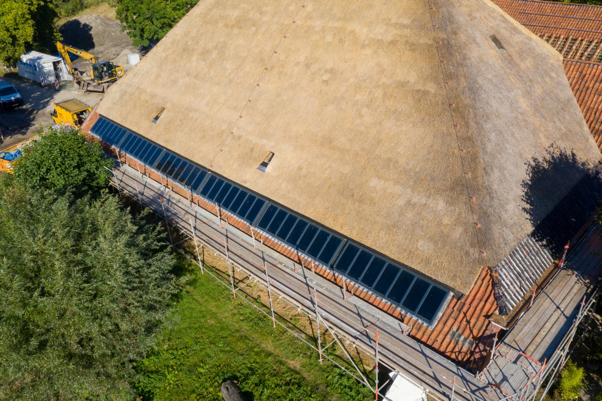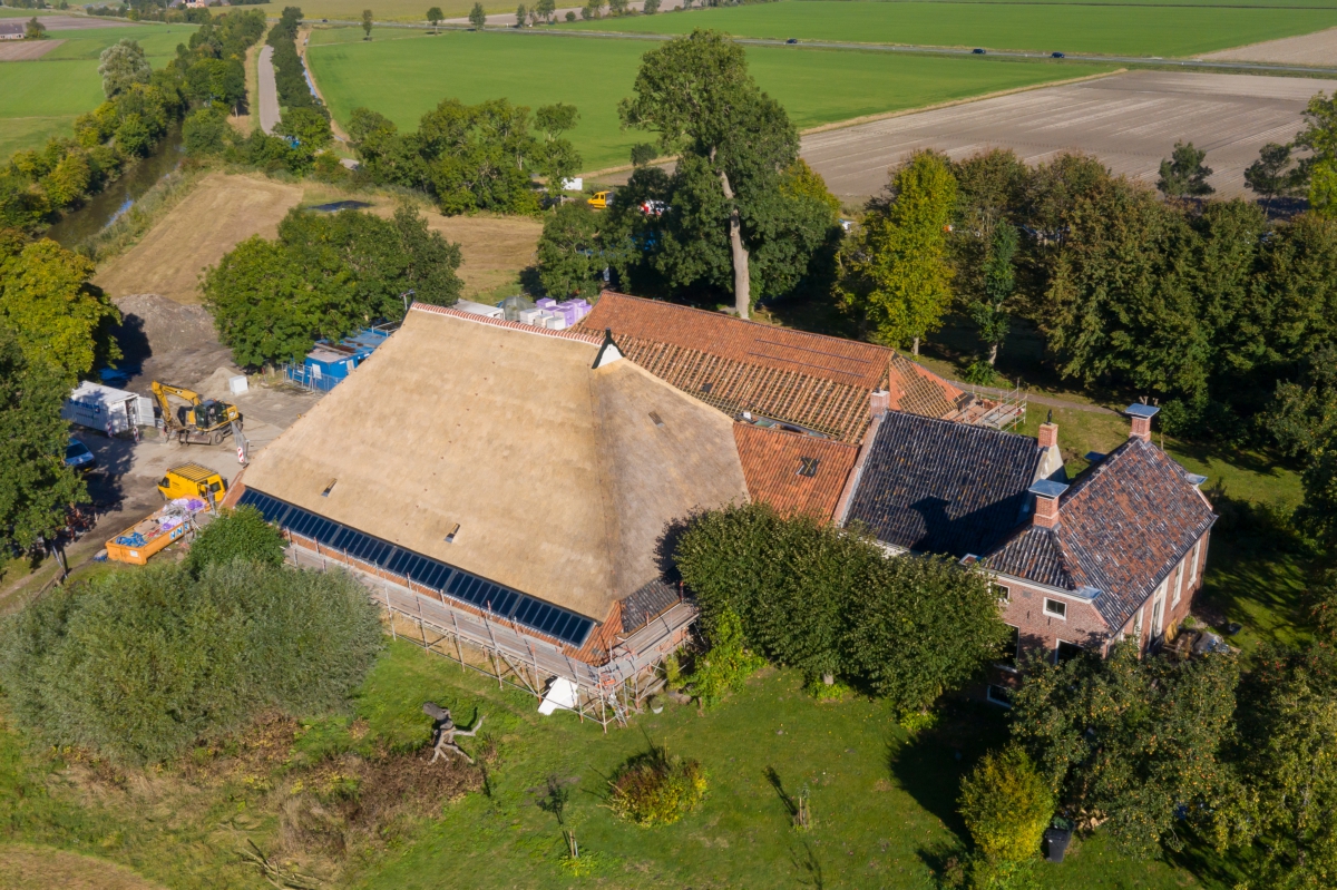 Het voorhuis werd gestript, de vloeren, muren en plafonds werden geïsoleerd door erkend restauratieaannemer Bouwgroep Dijkstra-Draisma.. Er kwamen voorzetwanden en in de spouwmuur zit isovlas. ‘In de ramen zit isolerend monumentenglas. In het woongedeelte zijn in het voorhuis radiatoren in de vensterbanken onder de ramen geplaatst, in het tussenhuis zijn standaard plaatradiatoren toegepast. Alleen in de ruimte met een estrikkenvloer en een bijzondere muurschildering is vloerverwarming aangebracht. De vloerverwarming zorgt ervoor dat er een constantere ruimtetemperatuur is, wat gunstig is voor het behoud van de muurschildering. De bedrijfsruimten zijn allen verwarmd door middel van vloerverwarming. Een hybride luchtwarmtepomp in combinatie met zonnepanelen zorgt voor warmte en elektriciteit.’ De zonnepanelen liggen op het dak van de schuren. ‘Ze liggen deels uit het zicht en een deel van de zonnepanelen is innovatief toegepast. Deze panelen zijn doorzichtig en functioneren voor de schuur als dakramen.’
