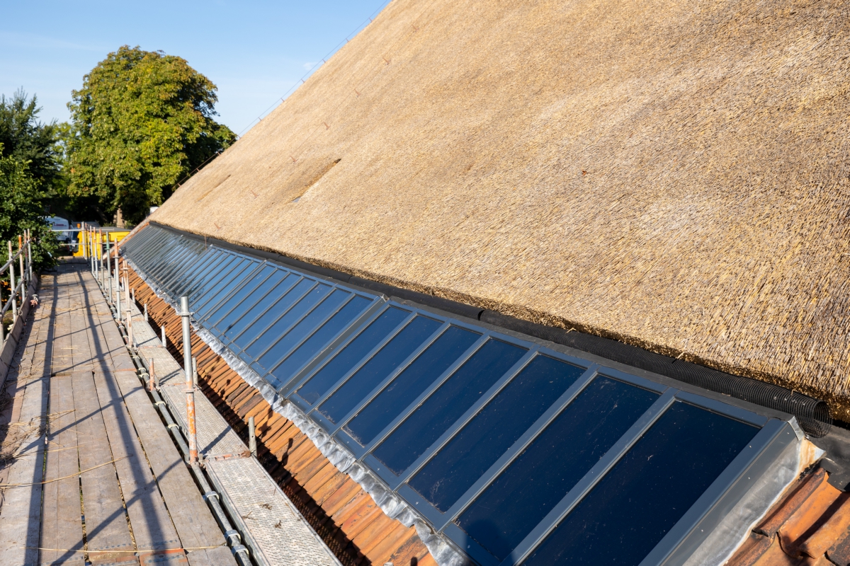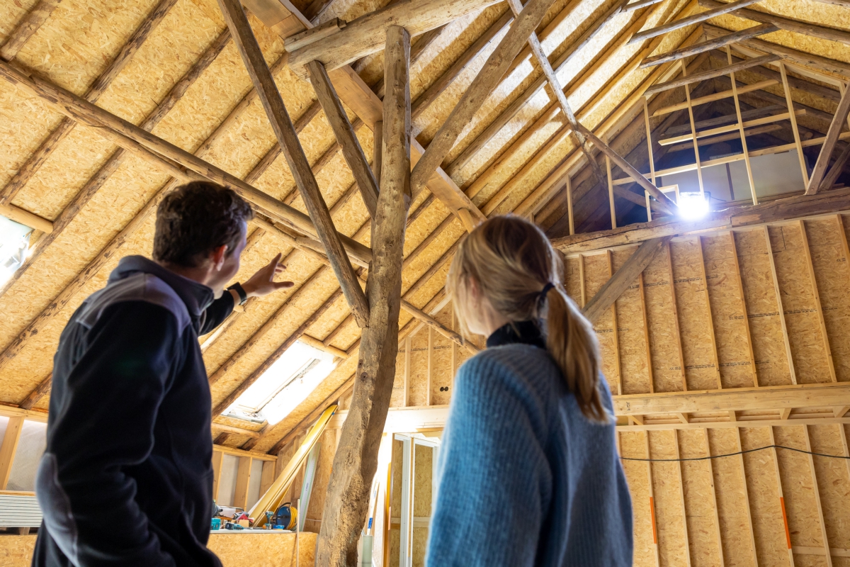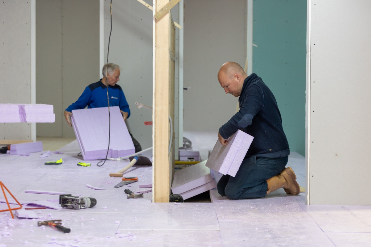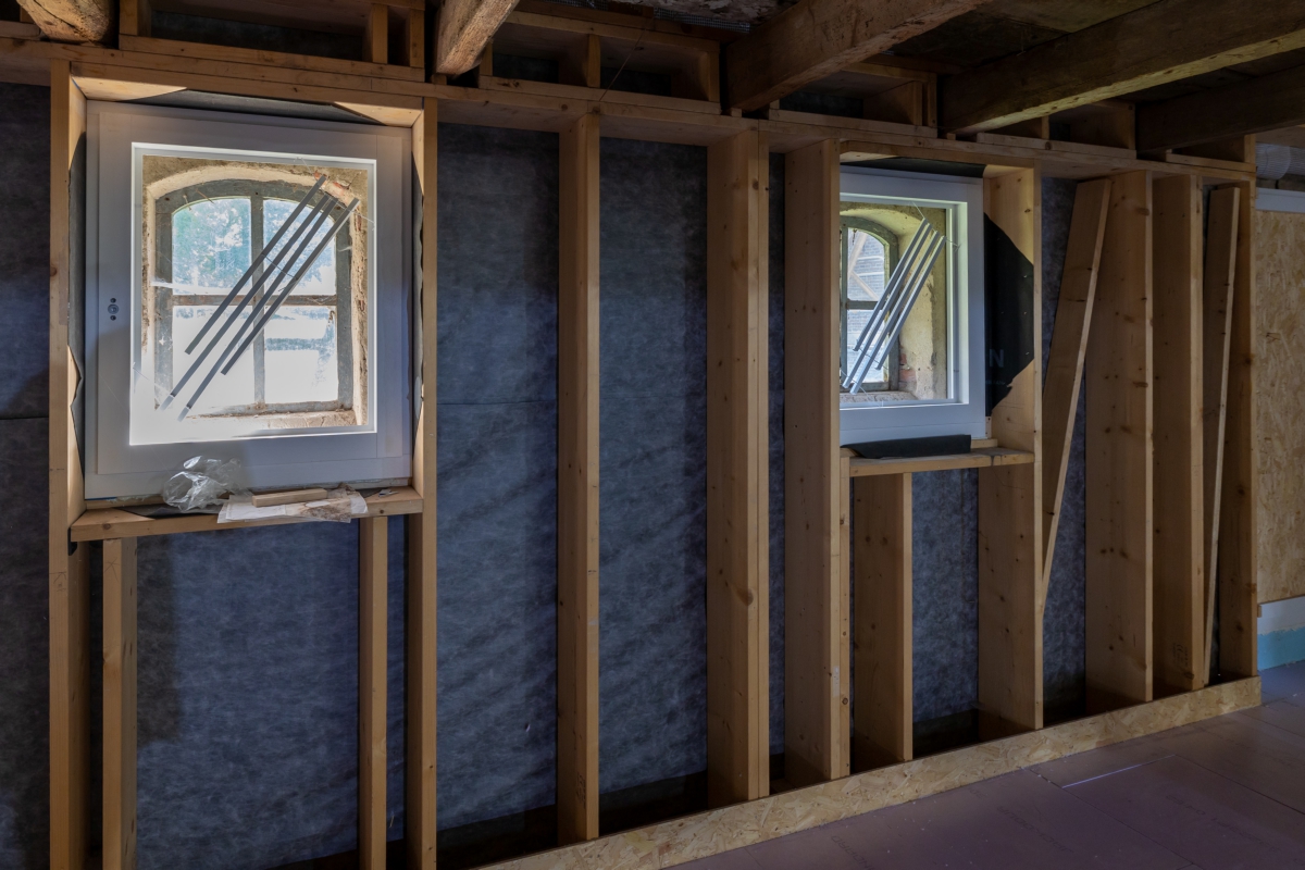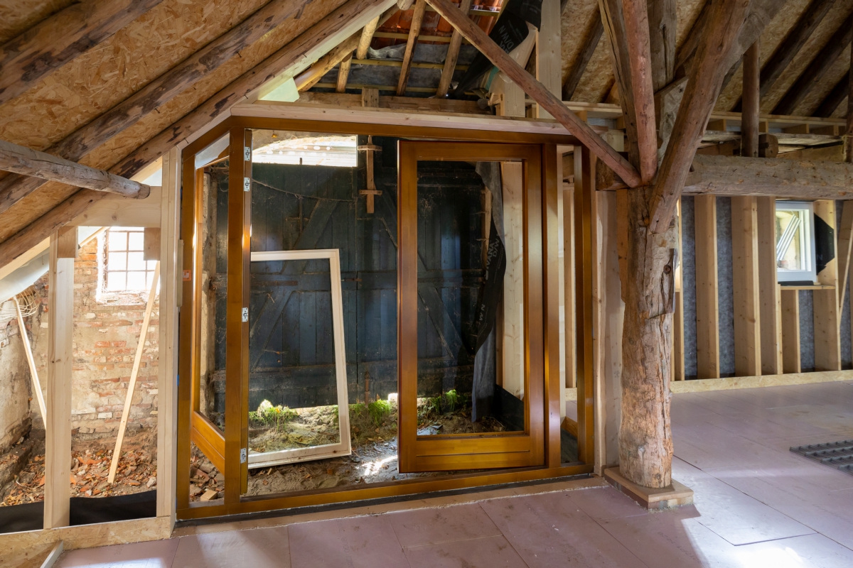 Het voorhuis werd gestript, de vloeren, muren en plafonds werden geïsoleerd door erkend restauratieaannemer Bouwgroep Dijkstra-Draisma.. Er kwamen voorzetwanden en in de spouwmuur zit isovlas. ‘In de ramen zit isolerend monumentenglas. In het woongedeelte zijn in het voorhuis radiatoren in de vensterbanken onder de ramen geplaatst, in het tussenhuis zijn standaard plaatradiatoren toegepast. Alleen in de ruimte met een estrikkenvloer en een bijzondere muurschildering is vloerverwarming aangebracht. De vloerverwarming zorgt ervoor dat er een constantere ruimtetemperatuur is, wat gunstig is voor het behoud van de muurschildering. De bedrijfsruimten zijn allen verwarmd door middel van vloerverwarming. Een hybride luchtwarmtepomp in combinatie met zonnepanelen zorgt voor warmte en elektriciteit.’ De zonnepanelen liggen op het dak van de schuren. ‘Ze liggen deels uit het zicht en een deel van de zonnepanelen is innovatief toegepast. Deze panelen zijn doorzichtig en functioneren voor de schuur als dakramen.’