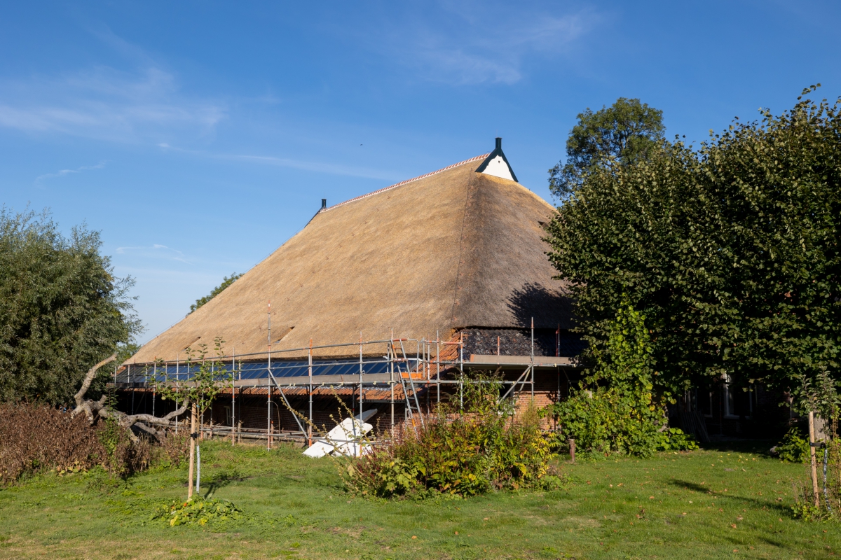Mayke en Gijs wisten lange tijd niet of hun plannen met de boerderij door konden gaan. Daar ging tijd overheen met een hoop rekenen en tekenen. ‘Maar we dachten: laten we alvast beginnen met de deur openzetten. We haalden het onkruid weg, wasten de ramen en vertelden aan iedereen die het maar horen wilde, wat we met ‘Op Maarhuizen’ voor plannen hadden.We hebben vanaf 2018 steeds meegedaan met Open Monumentendag. Dan kon iedereen zien hoe het er hier uitzag. Verder deden we mee als locatie voor de Zomerjazz fietstour, een evenement dat hier op het Groninger land al jaren in augustus veel bezoekers trekt. Ook hebben we ieder jaar een appelfeest in de boomgaard. Iedereen mag dan komen helpen met de oogst en ook zelf wat meenemen.’ De boomgaard is een van Mayke’s favoriete plekken: ’Hier staan veel oude boomsoorten. De oogst en het inmiddels traditionele appelfeest is weer achter de rug. Daarna is het tijd voor snoeien. Dat wordt gedaan door een organisatie uit Winsum die cursussen boomsnoeien geeft. Dat is een leuke samenwerking.’